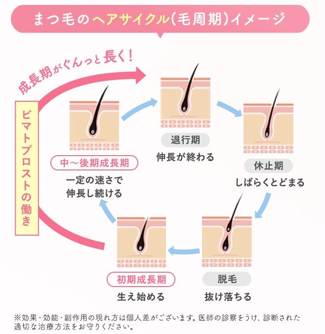 - ビマトプロストは、毛包の成長期を延長し、毛根細胞の増殖を促進します。これにより、まつげが成長し続ける期間が長くなるため、結果的にまつげが長く、太くなるのです。