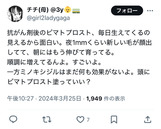 - また、ビマトプロストは血流を改善し、毛根への栄養供給を増加させることでまつげの健康をサポートします。